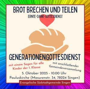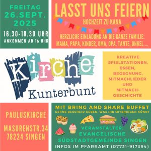 Diese Vision haben wir für uns als Evangelische Südstadtgemeinde Singen gefunden. Wir sind eine landeskirchliche Gemeinde mit ungefähr 2500 Gemeindegliedern im Süden Deutschlands und im Süden unserer Stadt. Viele Nationen leben durch die großen Industriegebiete in unserer Stadt und wir wollen sie durch einen lebendigen und bibelzentrierten Glauben einladen bei Gott und bei uns Heimat zu finden.